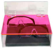Can hold up to 6 pairs of safety glasses. Neon Red acrylic door keeps